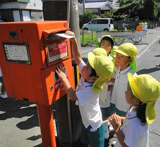 幼稚園のすぐ近くのポストへ。